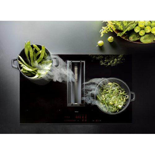 Особенности модели индукционная варочная панель с вытяжкой для режима отвода вохдуха, корпус из нержавеющей стали AISI 304, автоматическое открытие и закрытие всасывающих элементов, бесщеточный двигатель с 9 скоростями + режим Booster, функция Keep Warm (42/70/94 градуса), предупреждение о насыщении жирового фильтра, предупреждение о насыщении фильтра Carbon.Zeo, технология Flex Surface, класс энергоэффективности: A++