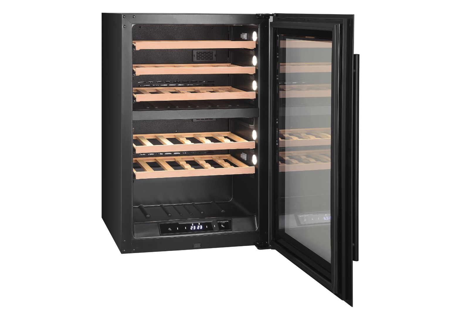 Полки из дерева обеспечивают безопасное размещение бутылок, а мягкая светодиодная подсветка придает шкафу элегантность.