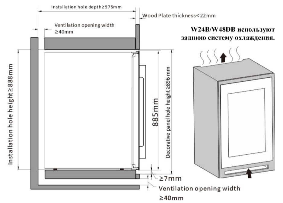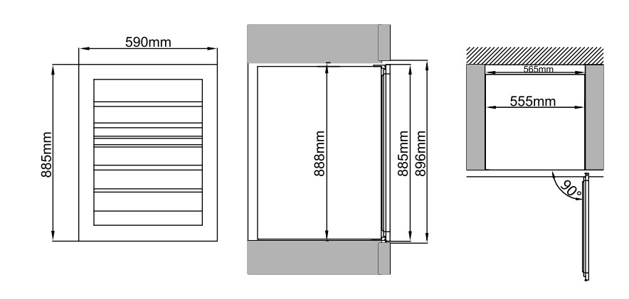 - При установке с помощью ножек отрегулируйте винный шкаф по уровню и убедитесь в наличии необходимых зазоров между дверью и мебельными фасадами, чтобы не повредить их.